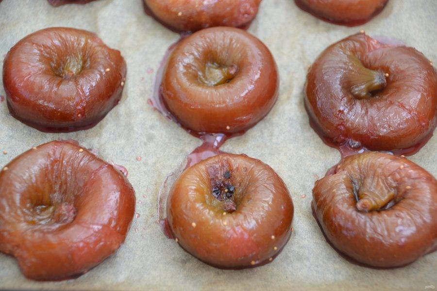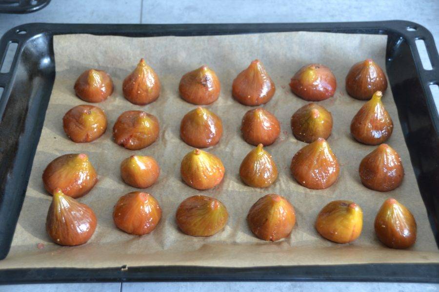 После двух часов сушки достаньте инжир из духовки и нажатием пальца утопите внутрь кончики инжира, слегка приплющите их и снова поставьте в духовку на 2 часа при том же температурном режиме.