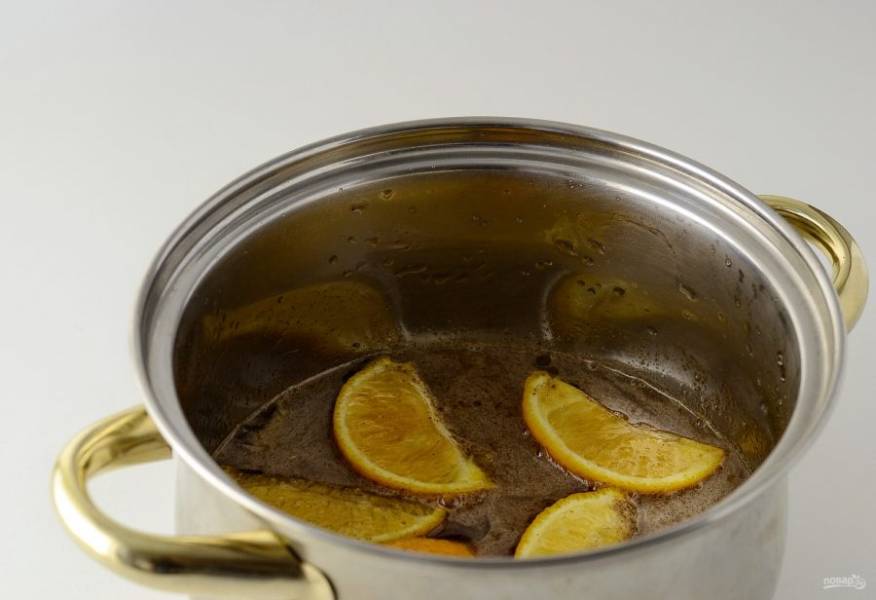 Добавьте корицу и апельсин, порезанный дольками. Проварите сироп 10-15 минут, затем уберите апельсин.
