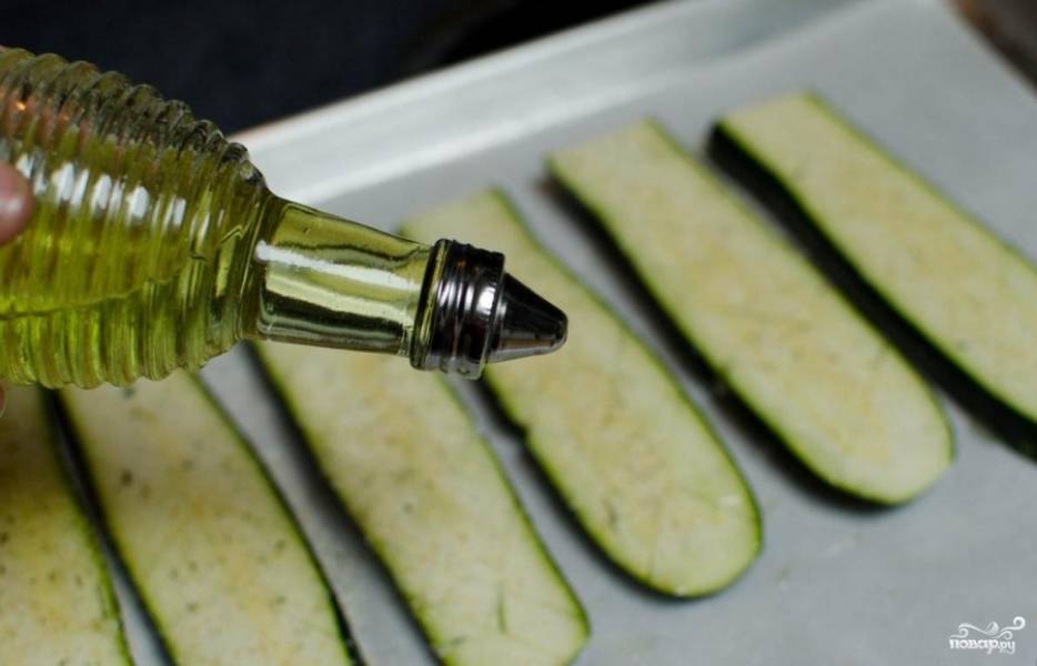 Цукини хорошенько промываем, просушиваем и нарезаем пластинами вдоль, отрезав попки. Нарезка должна быть ровной и аккуратной, это очень важно! Затем пластины выкладываем на противень, застеленный бумагой для выпекания. На пластинах делаем неглубокие, но частые надрезы. Солим, перчим их.