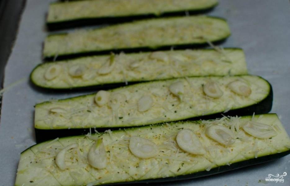 Цукини поливаем оливковым маслом, соком лимона. Сверху укладываем нарезанный пластинами или небольшими ломтиками чеснок и посыпаем натертым пармезаном. Разогреваем духовку до 200 градусов.