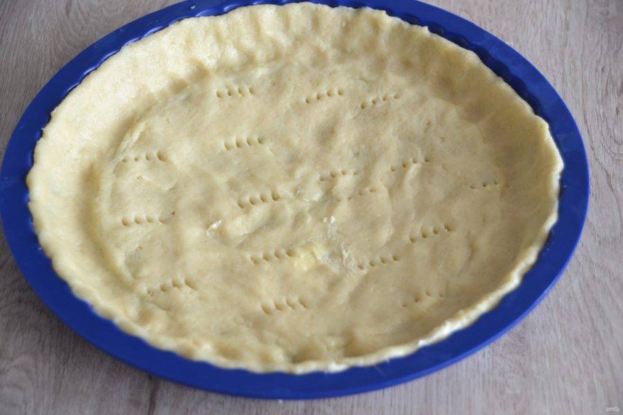 Распределите тесто по форме для выпечки, сформируйте бортики, вилкой сделайте на дне проколы, уберите в морозильную камеру на 10 минут.