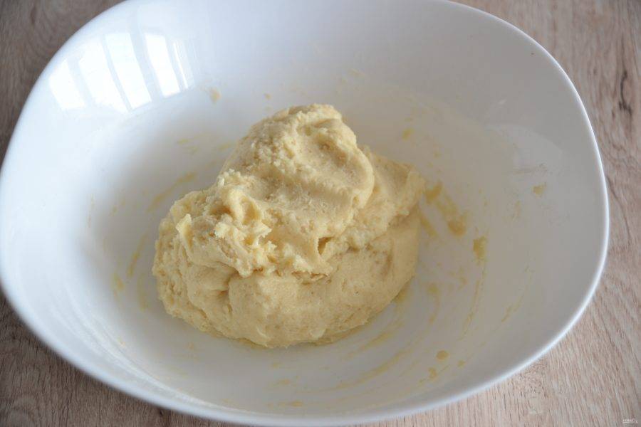 Всыпьте смесь муки и разрыхлителя в миску, замесите тесто, соберите в шар, уберите в холодильник на 20-30 минут.
