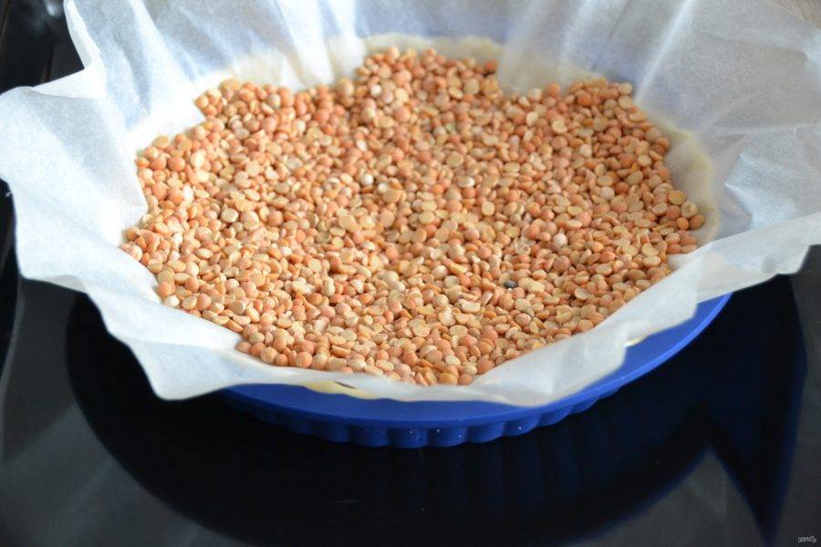 Предварительно подпеките основу для пирога. Для этого застелите пирог пергаментом, насыпьте какую-нибудь крупу, запеките при температуре 180 градусов 10-15 минут.