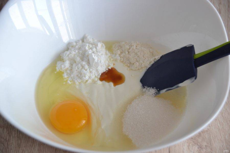 Для заливки смешайте сметану (0,5-2/3 стакана), сахар, крахмал и 0,5 ст.ложки муки, добавьте экстракт ванили, вбейте 1 яйцо.
