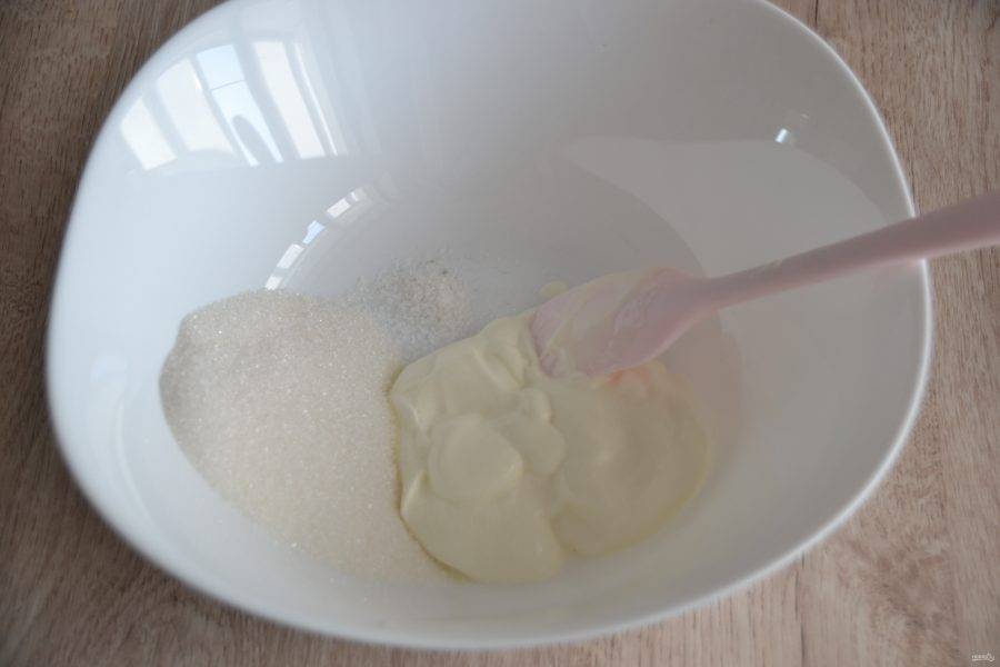 В миску для замешивания теста выложите 1/3 стакана сметаны, всыпьте сахар, щепотку соли.