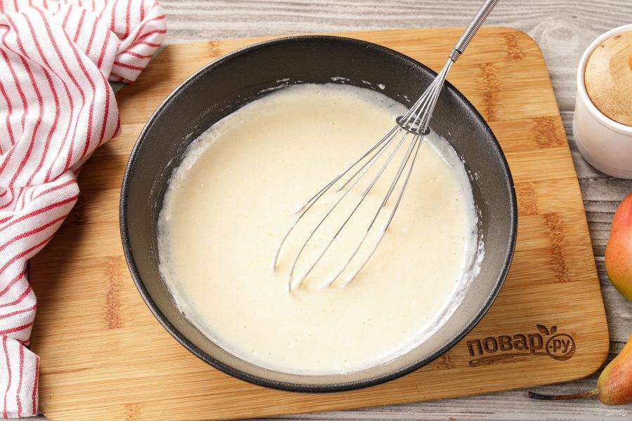 Венчиком перемешайте ингредиенты до однородного состояния. Заливка по консистенции должна напоминать нежирную сметану.