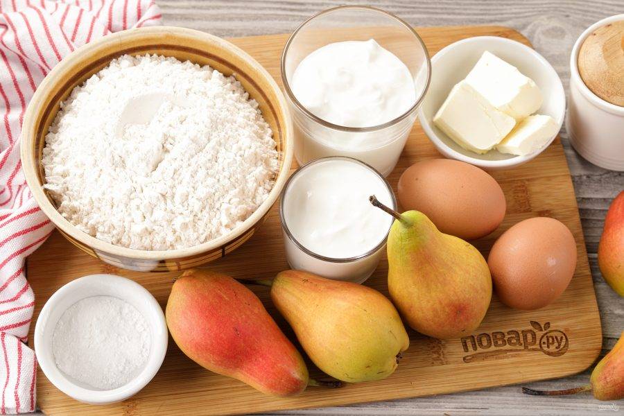 Груши разрежьте на две части, вырежьте семенной отдел и каждую половинку нарежьте тонкими ломтиками. Выложите по кругу внахлест на дне основы из теста.