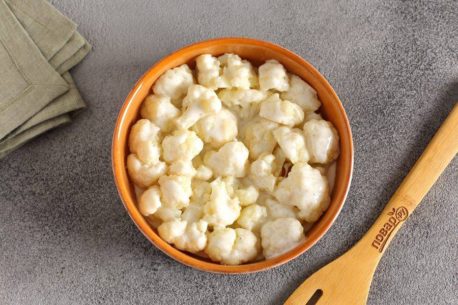 Форму для запекания смажьте маслом. Соцветия разрежьте на 2-3 части и выложите ровным слоем.