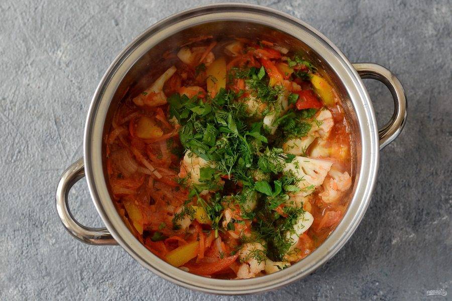 Перелейте в кастрюлю томатную смесь, добавьте соль, сахар и черный перец. Влейте растительное масло. Доведите до кипения. Добавьте все овощи и мелко порубленную зелень, проварите 10 минут.