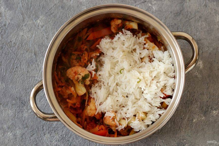Затем добавьте рис. Варите еще 30-40 минут. За 5 минут до готовности влейте уксус.