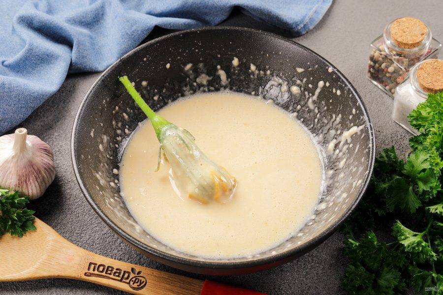 Для кляра соедините муку, яйцо и воду. Посолите и взбейте. Возьмите цветочек за веточку и окуните в кляр, сначала с одной стороны, а затем с другой.