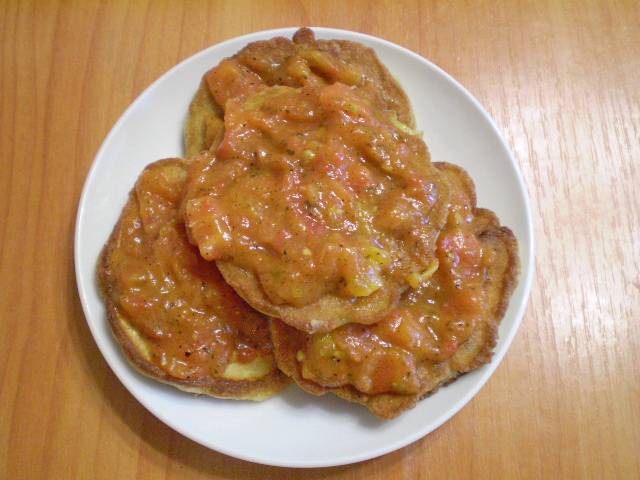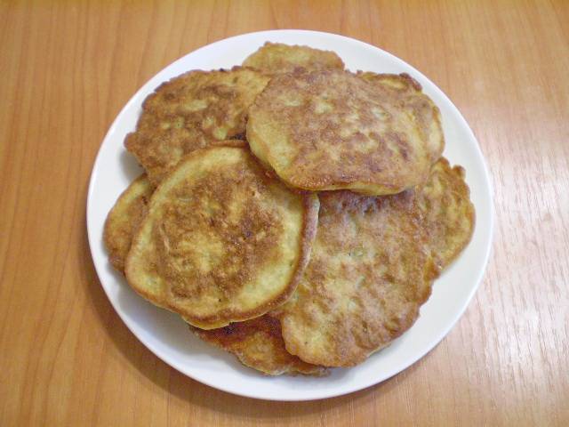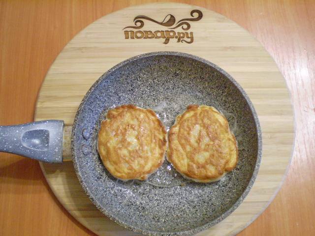 7. Разогреваем масло на сковороде. Ложкой выкладываем тесто, формируя круг или овал. Жарим.