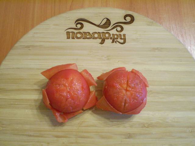 10. Помидоры ошпариваем кипятком, делаем надрезы на кожуре и снимаем её.
