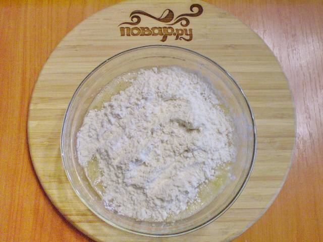 5. Вводим муку, я иногда кладу щепотку соды, гашу уксусом, но можно и без соды обойтись.