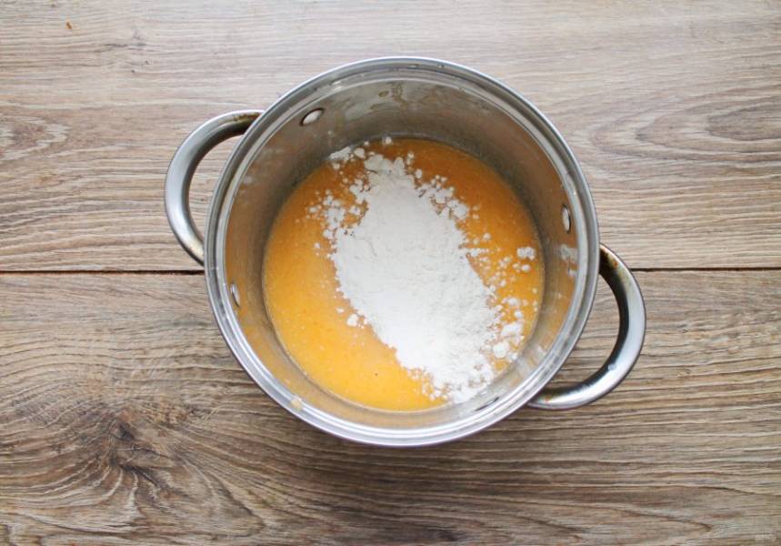 Просейте в кастрюлю с пюре муку и тщательно перемешайте до однородности.