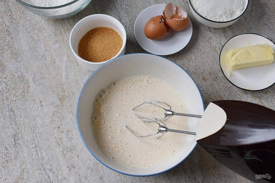 Всыпьте мучную смесь и на низкой скорости вмешайте в яичную.