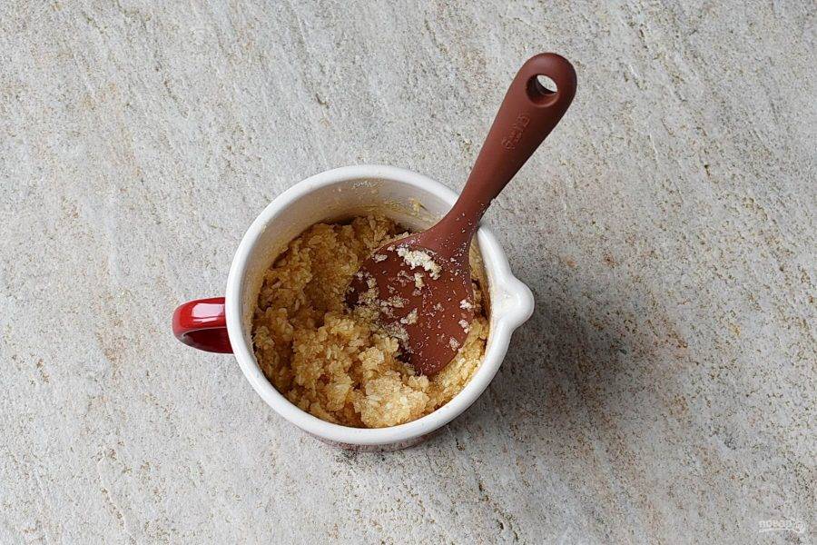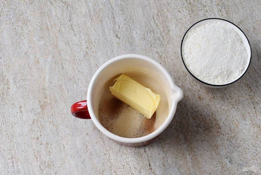 Пока тесто выпекается, приготовьте посыпку. Растопите в небольшой кастрюльке масло, молоко и коричневый сахар до полного растворения и закипания.