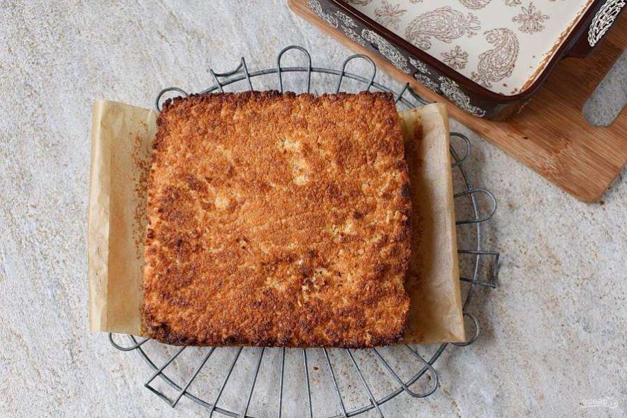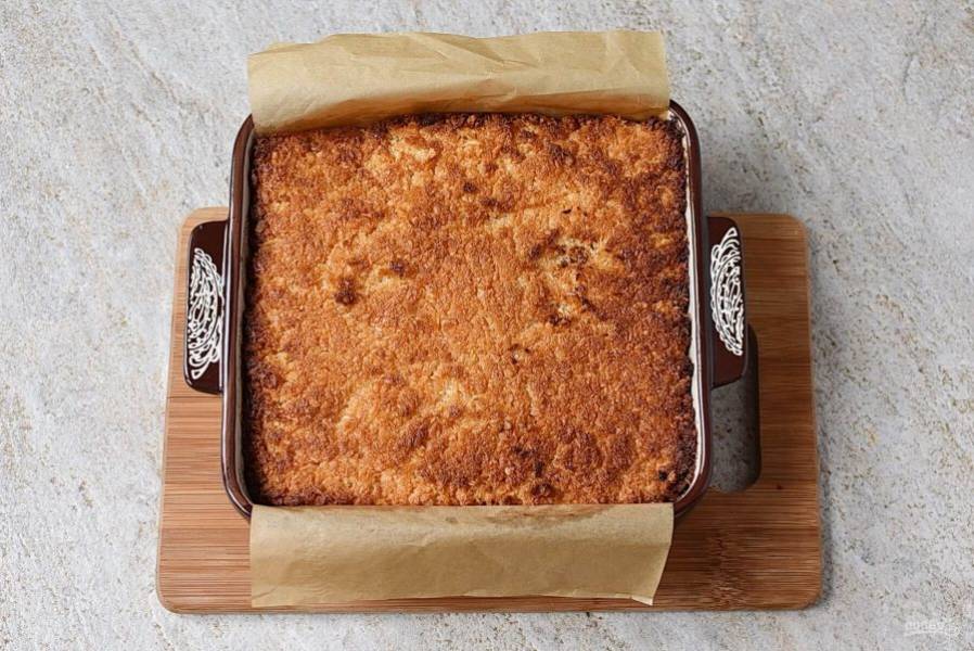 Выпекайте еще минут 7-10, пока кокос не подрумянится. Следите за вашей духовкой. Достаньте пирог и дайте остыть в форме минут 10.