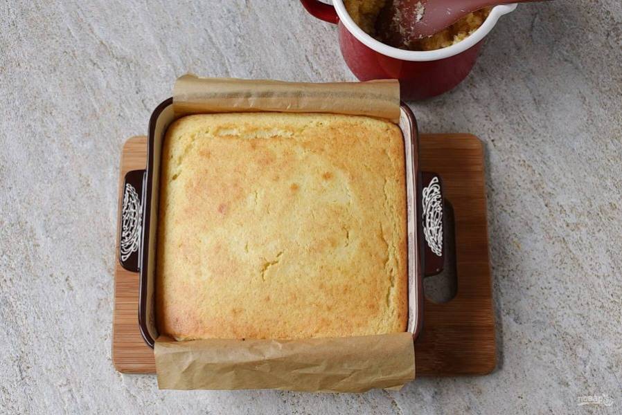 Выложите кокосовую массу поверх пирога. Разровняйте верх.