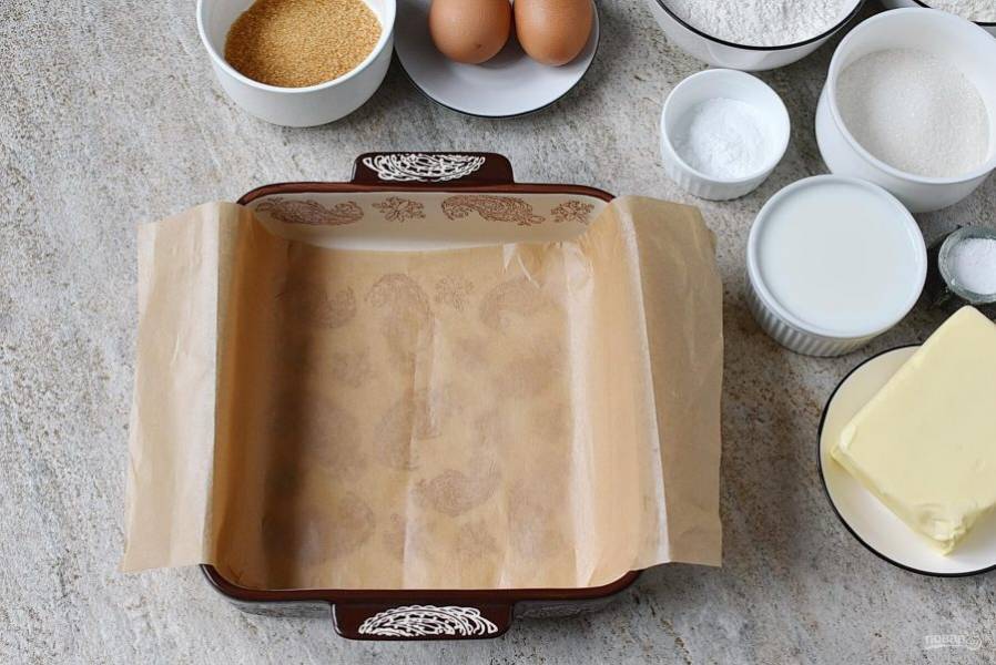 Форму размером 20х20 см. застелите бумагой для выпечки, оставив свободные края, чтобы было удобно достать пирог.