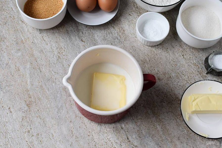 Разогрейте в небольшой кастрюльке молоко и масло для коржа. Держите кипящим.