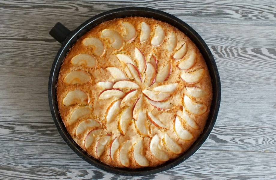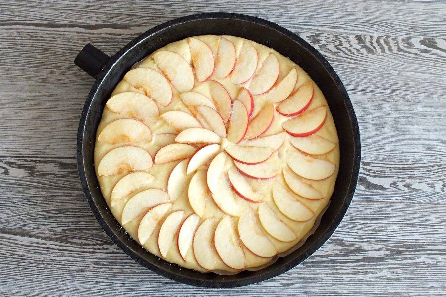 Форму для выпечки смажьте сливочным маслом или застелите бумагой для выпечки. Перелейте тесто, сверху разложите яблоки. Посыпьте сахаром. Поставьте выпекаться пирог в разогретую до 180 градусов духовку на 25-30 минут.