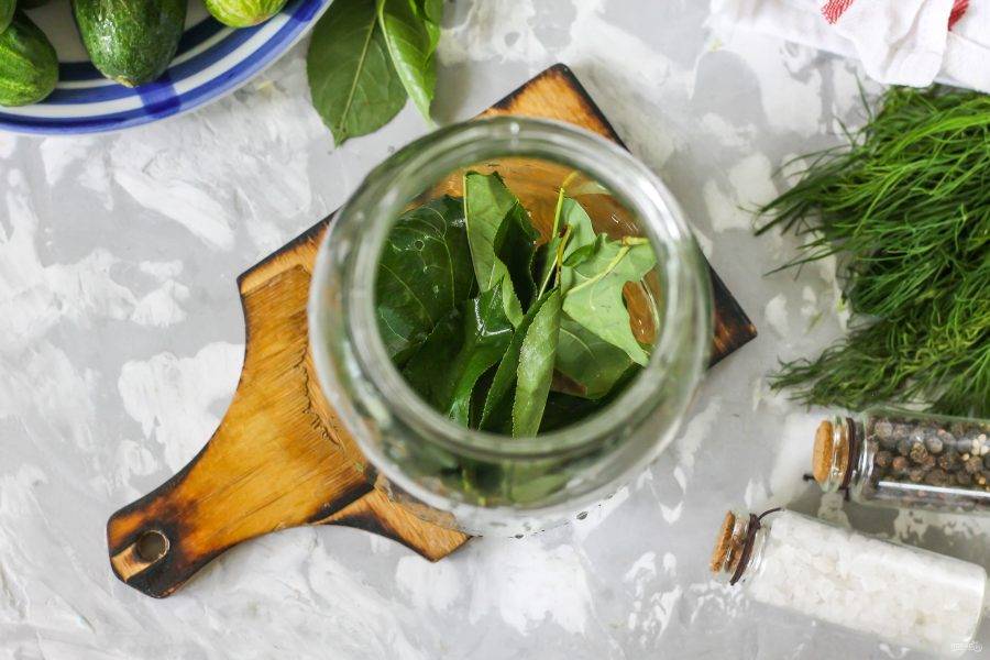 Промойте листья хрена или дуба, вишни или смородины, выложите их в чистые банки.