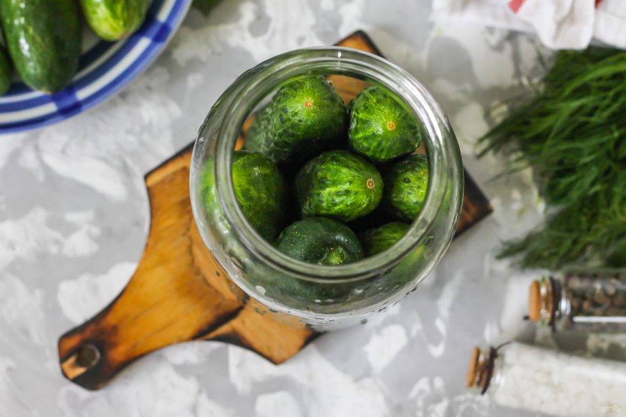 Промойте огурцы, тщательно счищая с поверхности овощей шипы. Выложите в банки до верха.
