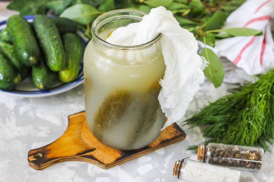 Влейте в банку холодную воду, отфильтрованную или из-под крана до плечиков емкости. Сбоку разместите мешочек с солью. Он должен быть наполовину погружен в воду. Поместите емкости в прохладное или холодное место сроком на 1-1,5 недели. Спустя 3-4 дня проверьте состояние огурцов, переверните их на другую сторону для равномерного посола.