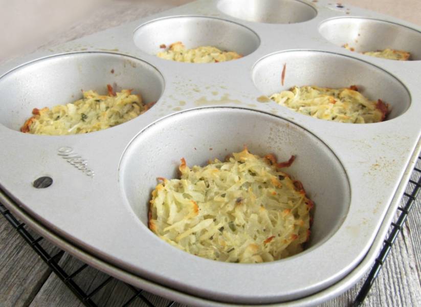 1. Картофель почистите и натрите на терке, выжмите сок. Луковицу также натрите. Смешайте тертый картофель, лук, измельченные перышки, яйцо, муку, соль, перец и тертый сыр. Выложите в смазанные маслом 6 формочек для маффинов.