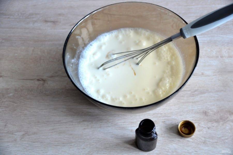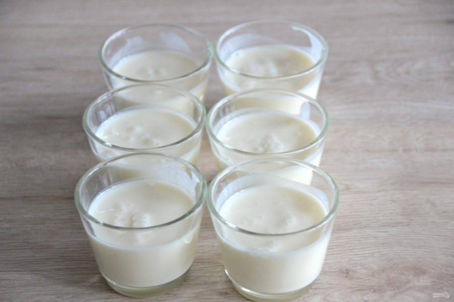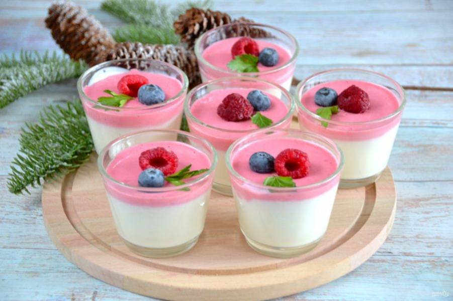 Через 15-20 минут после стабилизации светлой части десерта, влейте сверху ягодный слой. Дайте десерту полностью стабилизироваться, время стабилизации десерта зависит от качества используемого желатина. Перед подачей можно украсить ягодами, кусочками фруктов. Если десерт готовился без ягодного слоя, можно посыпать сверху корицей или какао.