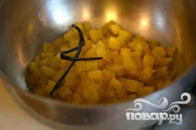 4. Из боба извлечь семена ванили и смешать их с 2 столовыми ложками сахара. Добавить смесь в яблоко, довести до кипения, накрыть крышкой, и варить 5-7 минут, помешивая, пока масса не станет мягкой. Снять кастрюльку с огня, дать остыть и вилкой раздавить в однородное пюре.