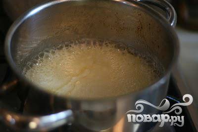 5. В еще одной кастрюльке полстакана сахара смочить оставшейся водой, поставить на огонь и нагревать, помешивая, пока сахар не растает. Когда сироп станет прозрачным, бросить масло, перемешать, добавить огонь и варить до карамельного цвета, уже не помешивая.