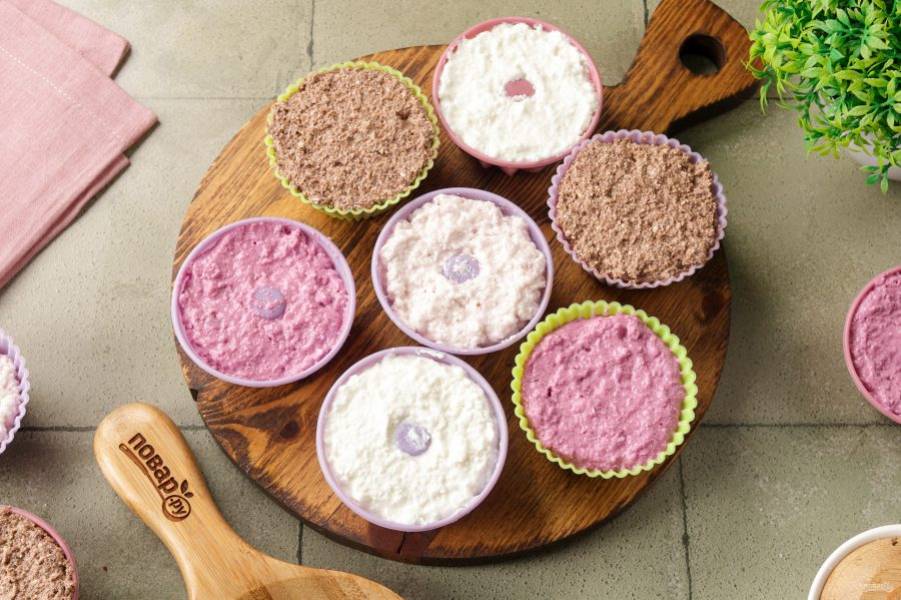 Разложите творожную массу в формочки или в креманки и поставьте в холодильник на 4 часа до полного застывания. Лучше работать с каждой частью сметанной массы отдельно и после добавления желатина сразу разливать по формочкам, так как масса быстро застывает.