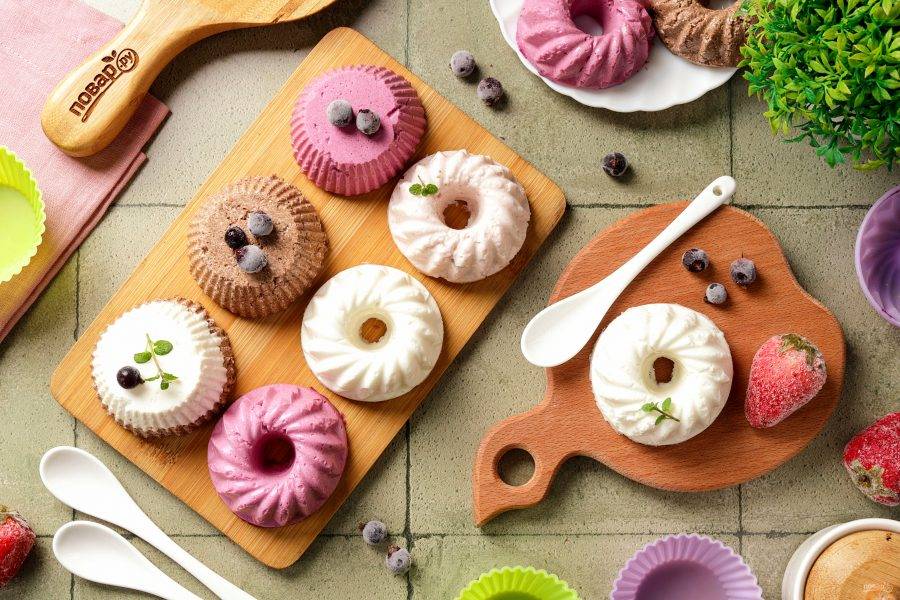 Подготовьте все ингредиенты по списку. Начинки для десерта могут быть из самых разных ягод и фруктов. У меня 4 вида: ванильная, с какао, с клубничным и черносмородиновым пюре.