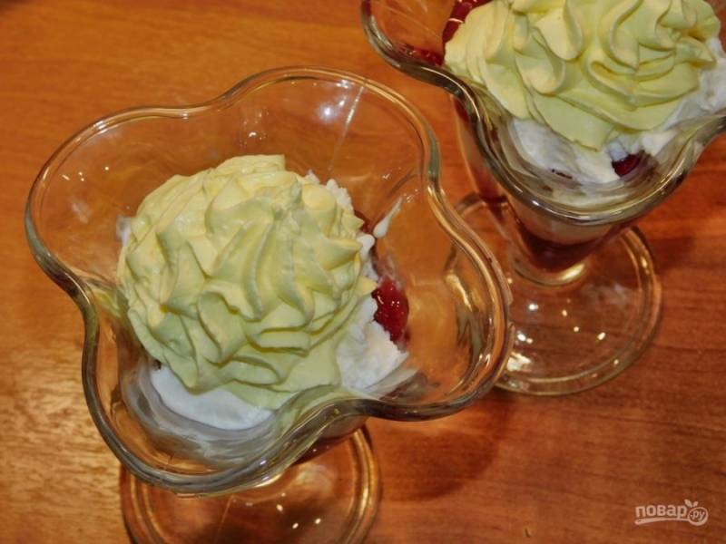 С помощью кондитерского мешка с насадкой, сделайте шапочку из взбитых сливок с сахарной пудрой.