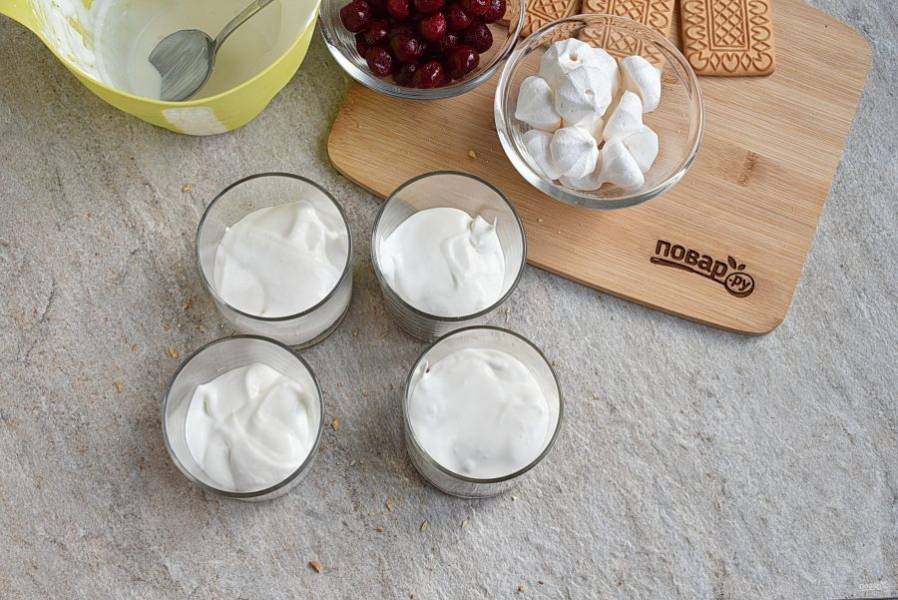 Взбейте охлажденные сливки с сахарной пудрой в пышную пену.