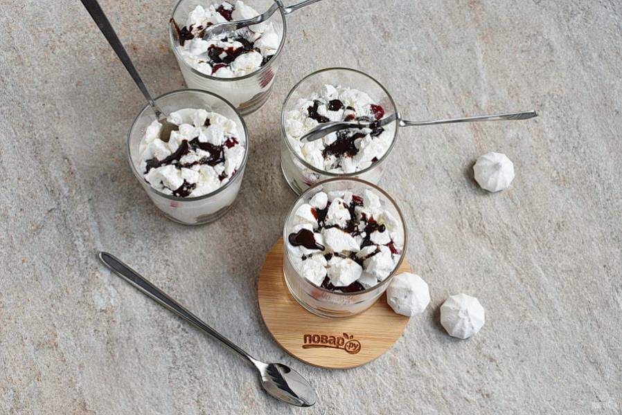 Сразу подавайте, пока меренги остаются хрустящими. При подаче можно полить десерт шоколадным сиропом.
