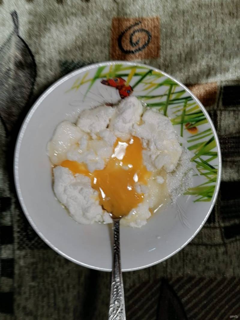 В творог (вкуснее будет если взять домашний) добавляем яйцо, 1 ст. ложку сахара и размешиваем до однородной массы.