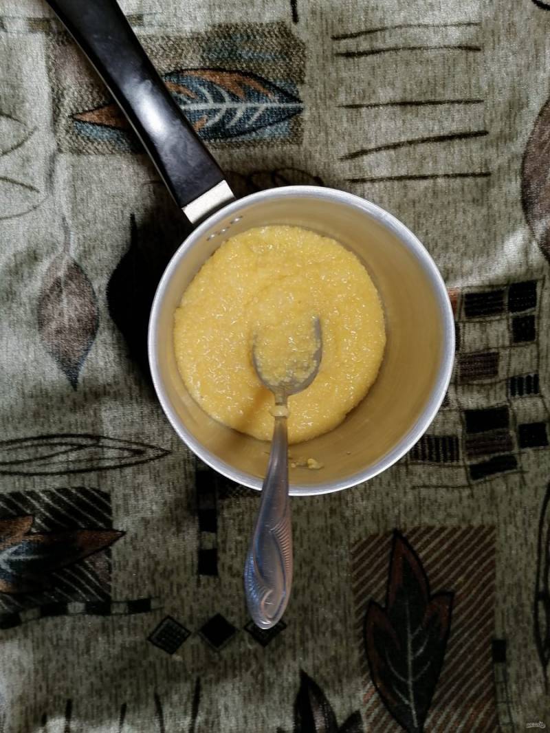 Приготовьте поленту "Bravolli" по инструкции на упаковке, не забудьте добавить в воду соль и 1 ст. ложку сахара.