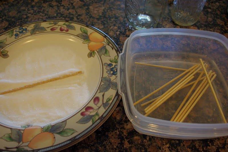2. Пока сахарная смесь варится, подготовим палочки. Вымачиваем их в воде, а затем окунаем в сахар. Ждем до полного высыхания палочек, это важно!