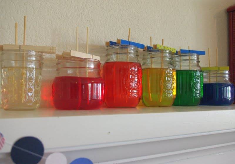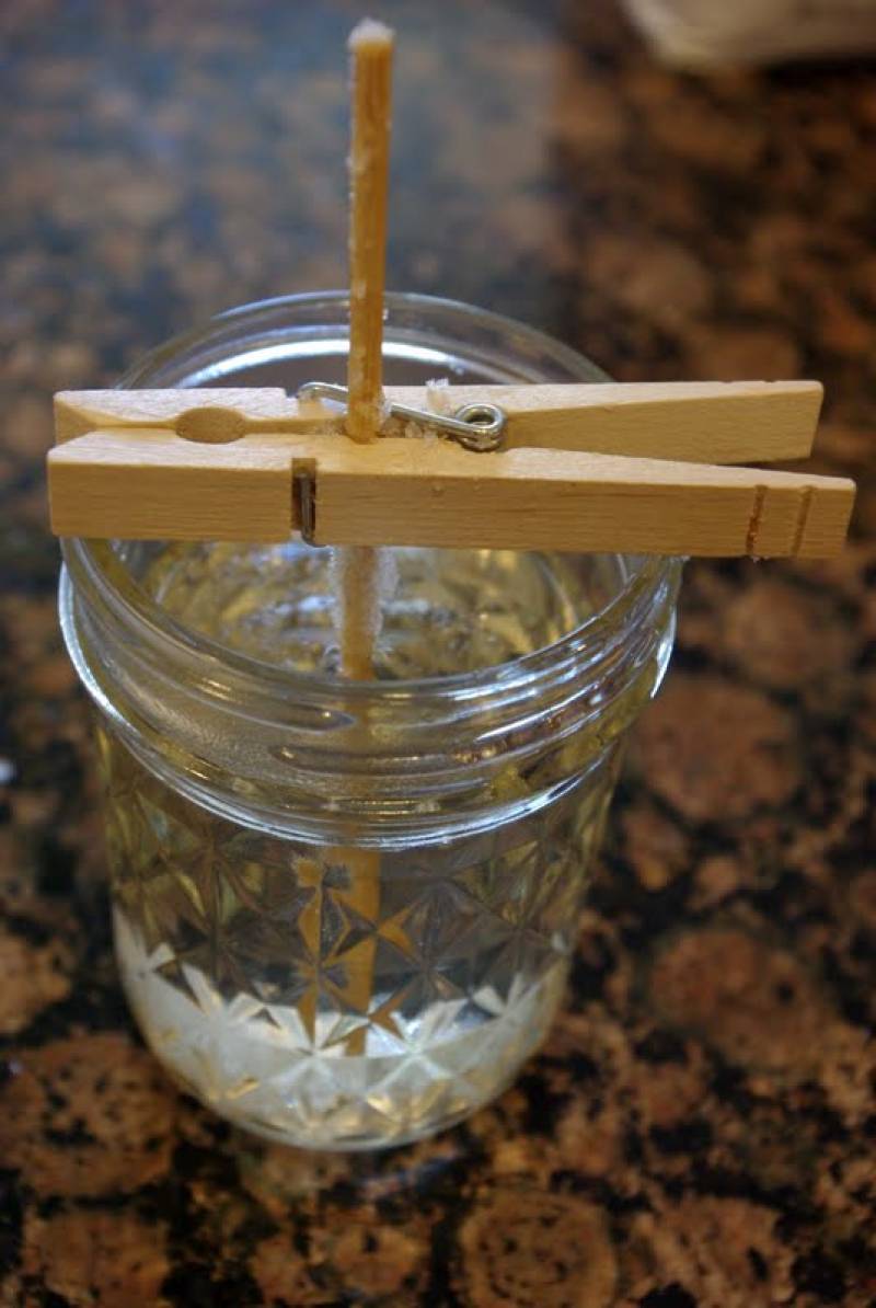 3. Теперь, когда наша сахарная смесь остыла, аккуратно вливаем ее в банки, добавляем красители и ароматизаторы по желанию. Аккуратно помещаем палочку внутрь. Следите, чтобы палочки не соприкасались с дном, стенками банки, или с другой палочкой в этой же банке.