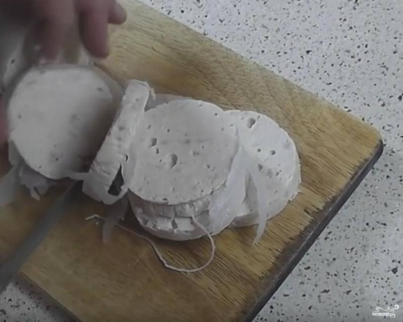 9. Достаньте готовую диетическую колбасу и нарежьте. Хранить такую колбасу можно в холодильнике не более 5 дней. Пергамент не снимайте, так колбаса не будет заветриваться и подсыхать.