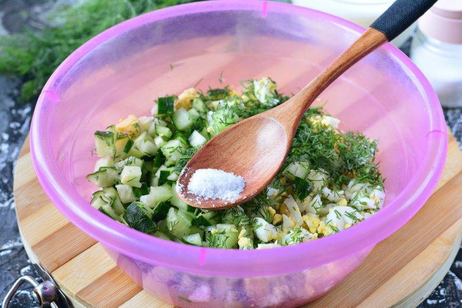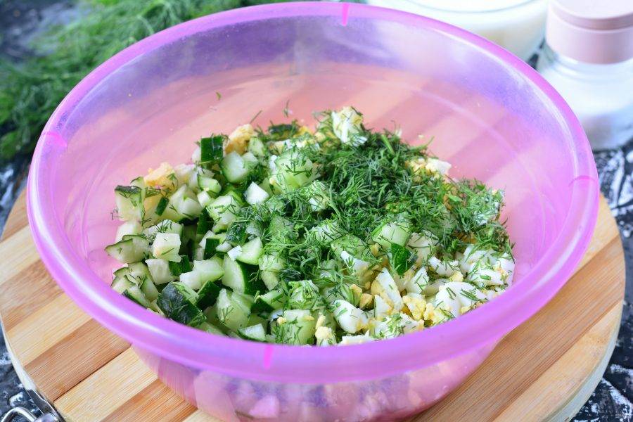 Смешайте в глубокой емкости нарезанные яйца, огурцы и укроп.
