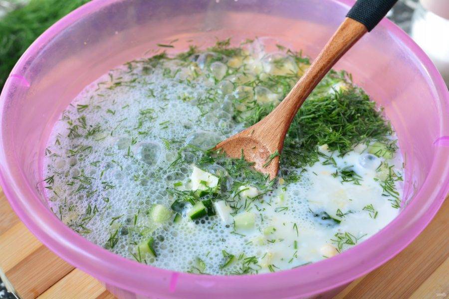 Залейте все компоненты кефиром и холодной минералкой. Воду можете взять как газированную, так и без газа. Перемешайте окрошку и блюдо готово.
