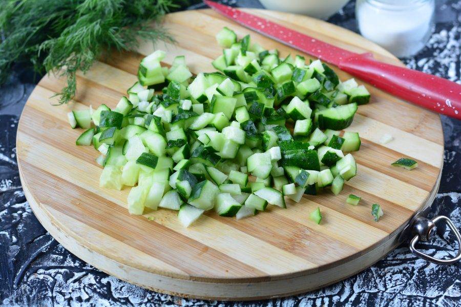 Свежие огурцы нарежьте кубиками.