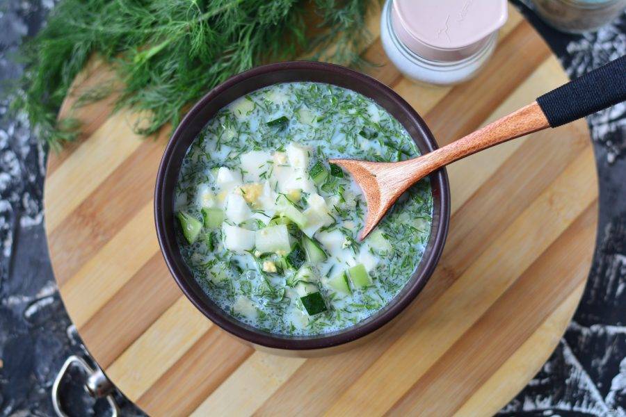 Кто же может отказаться от вкусной и аппетитной белой окрошки? Блюдо готовится на кефире или сметане с добавлением ваших любимых продуктов. Перед нарезкой продукты нужно охладить в холодильнике.