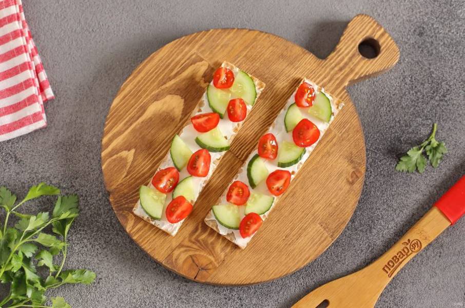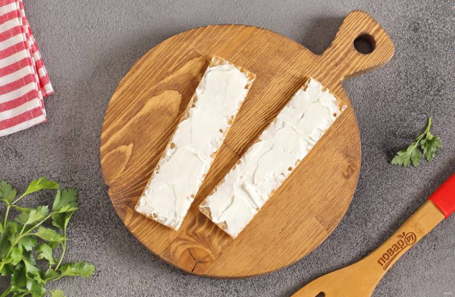 Намажьте хлебцы любым творожным сыром, с минимальным процентом жирности.