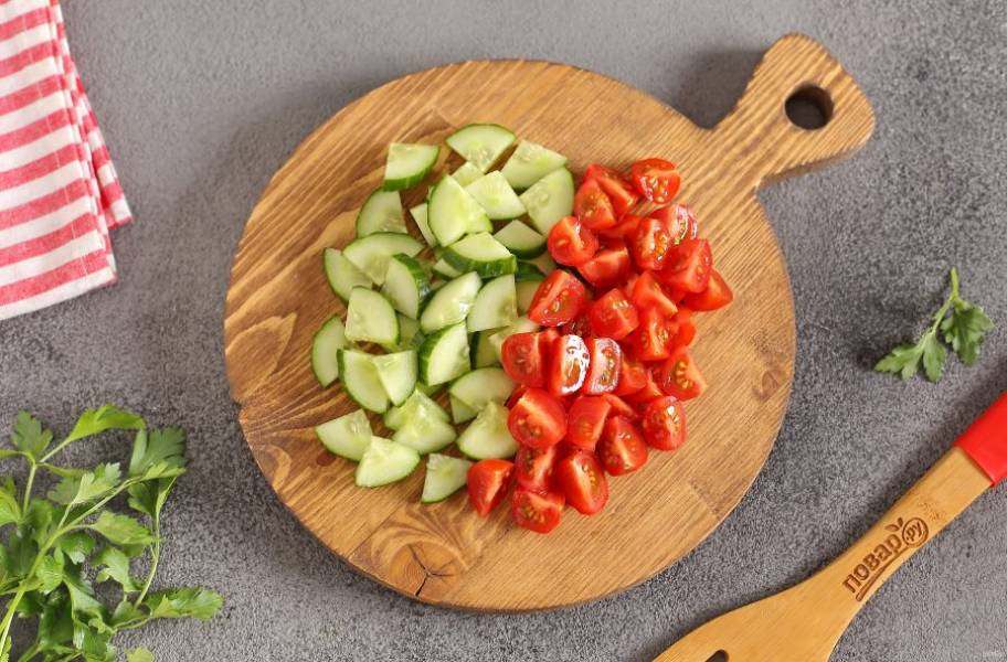 Огурец нарежьте кружочками, а затем каждый кружочек еще на 2-4 части. Помидоры черри разрежьте на 2 или 4 части, в зависимости от размера.