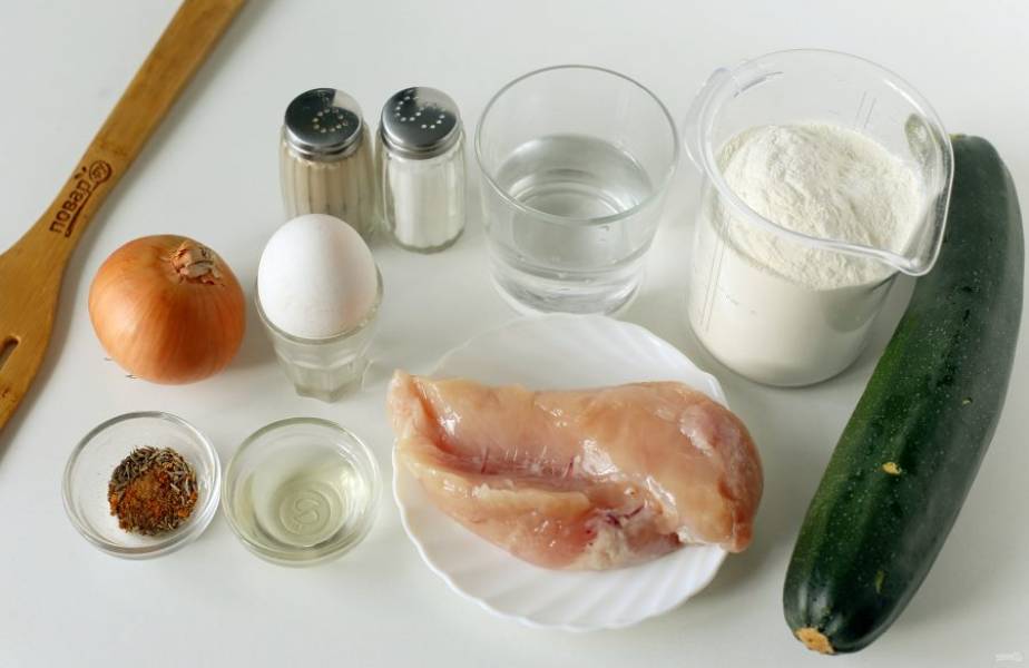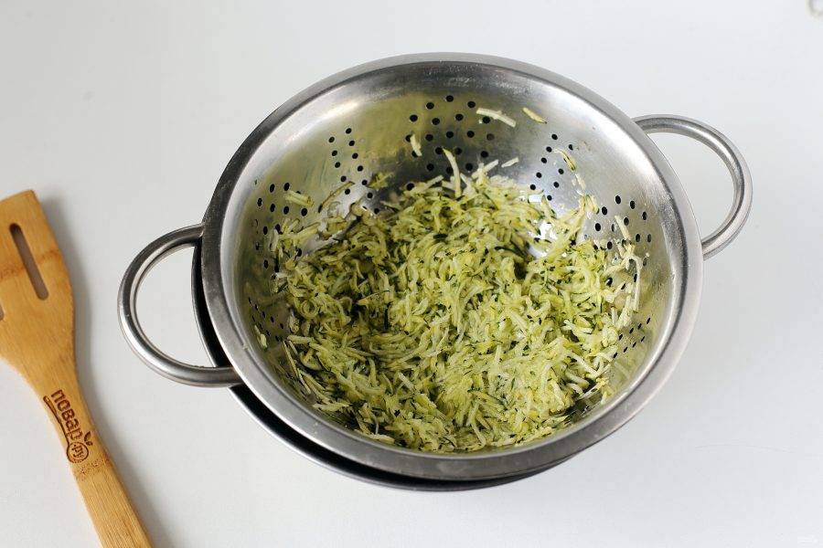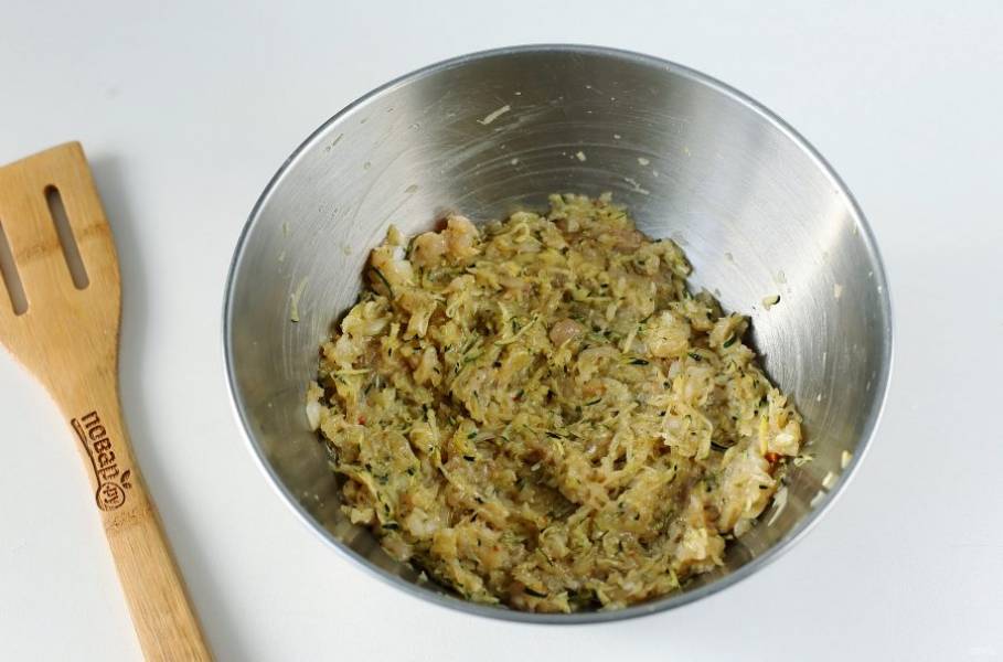 В глубокой миске соедините кабачок и куриный фарш. Добавьте по вкусу соль, любимые специи и перемешайте.